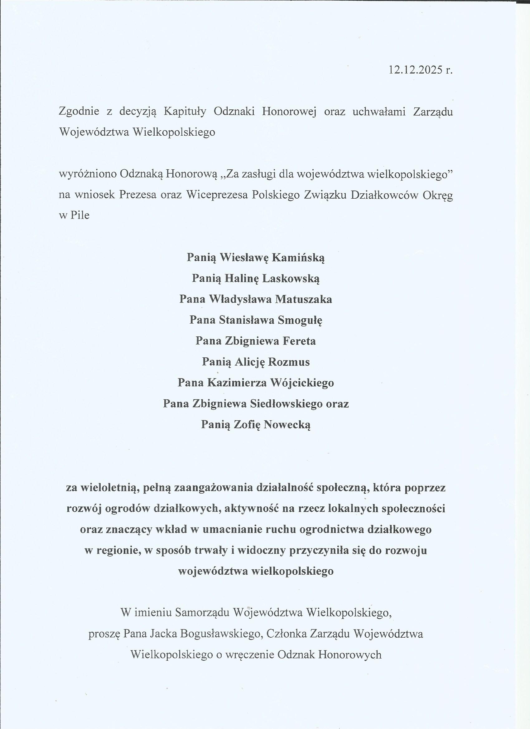 W pierwszej części posiedzenia odbyło się uroczyste wręczenie odznaczeń „Za Zasługi dla Województwa Wielkopolskiego”. Odznaczono dziewięciu zasłużonych działkowców – czytaj tutaj.