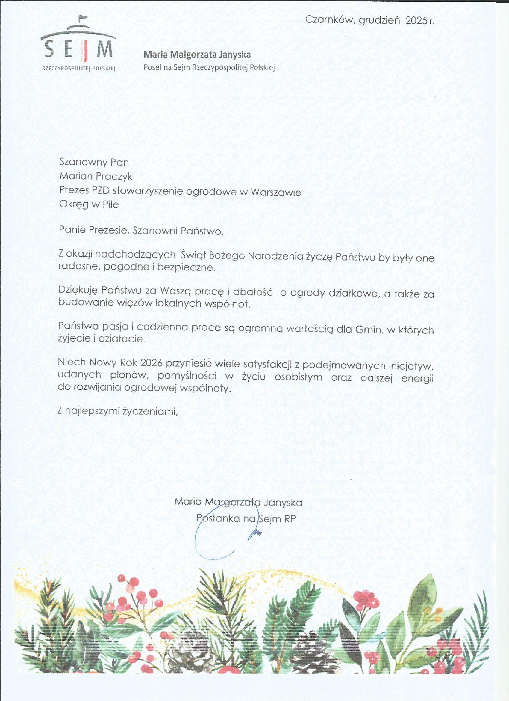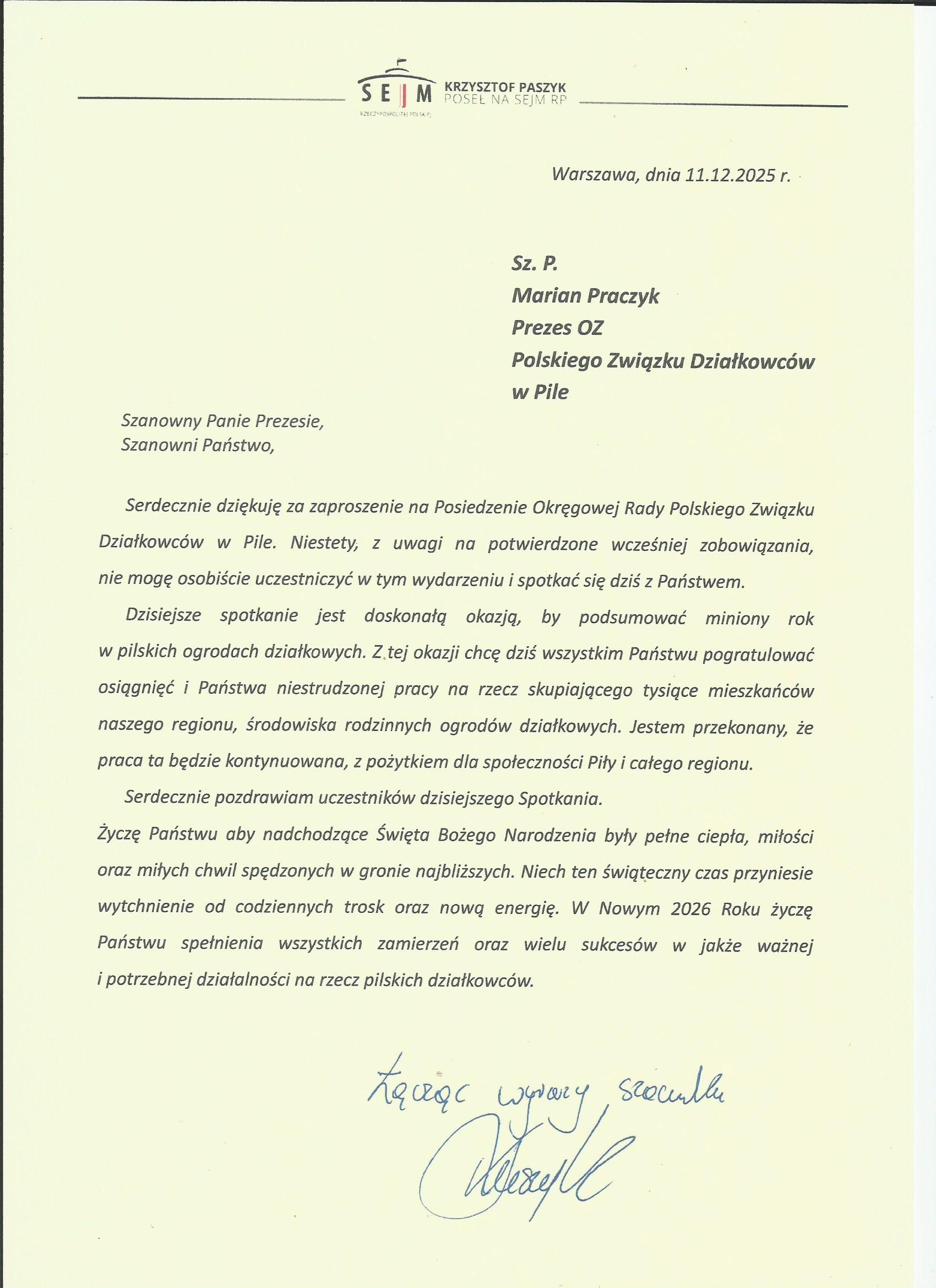 Zaproszeni goście w swoich wystąpieniach gratulowali osiągnięć, zapewniali o dalszym wsparciu na rzecz rozwoju ogrodnictwa działkowego oraz złożyli życzenia świąteczne i noworoczne. Katarzyna Ciołek odczytała życzenia od posła Krzysztofa Paszyka – czytaj tutaj. Marian Praczyk Prezes Okręgu odczytał życzenia przesłane od posłanki Marii Małgorzaty Janyska – czytaj tutaj.